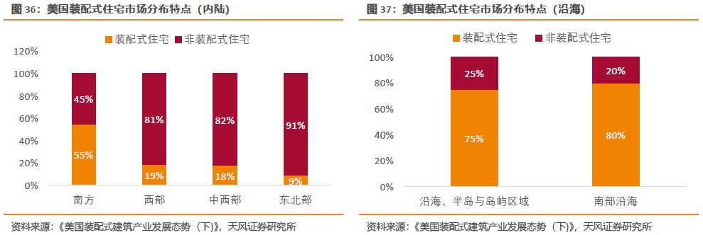 從市場分布來看,美國裝配式住宅在南方占比55%、西部19%、中西部18%、東北部9%;在全國沿海、半島與島嶼地區占比高達75%,南部沿海地區占比超過80%。主要原因是這些地區的低收入家庭、移民和退休人員比例大。