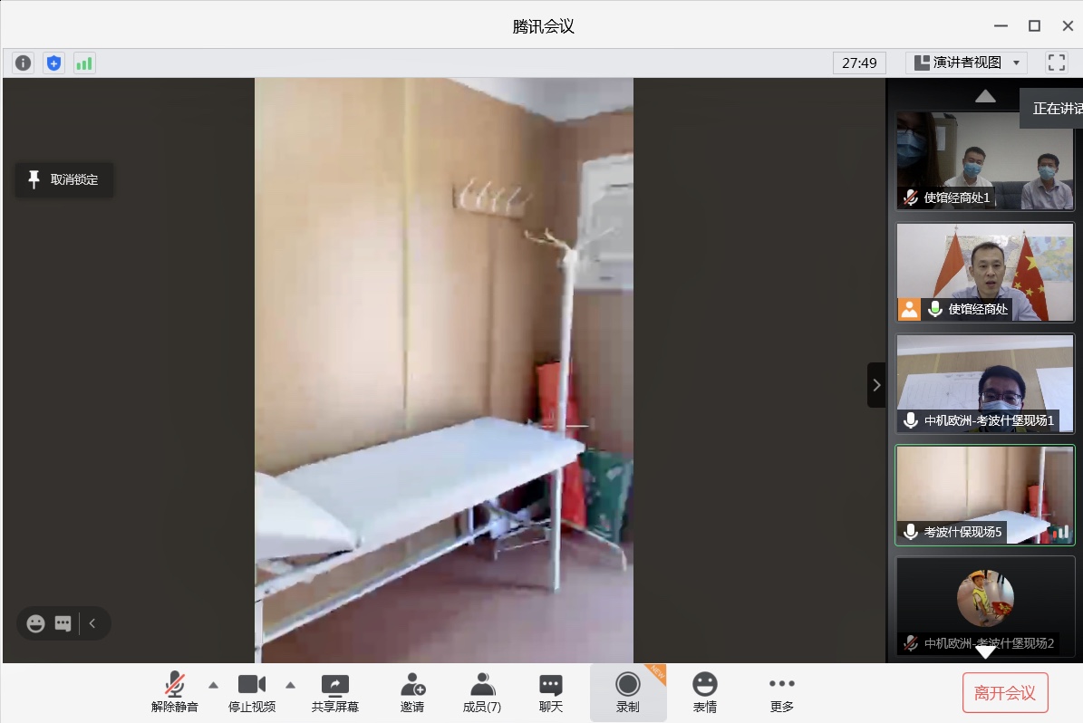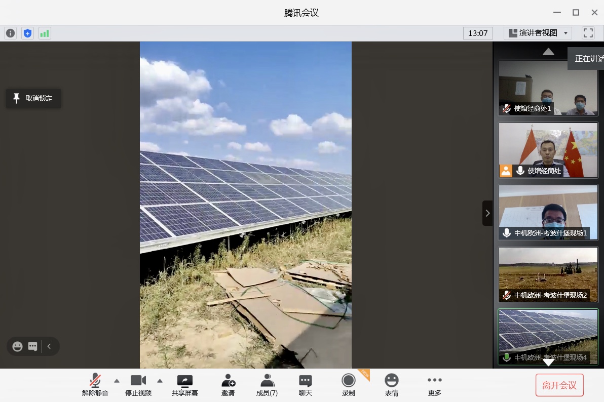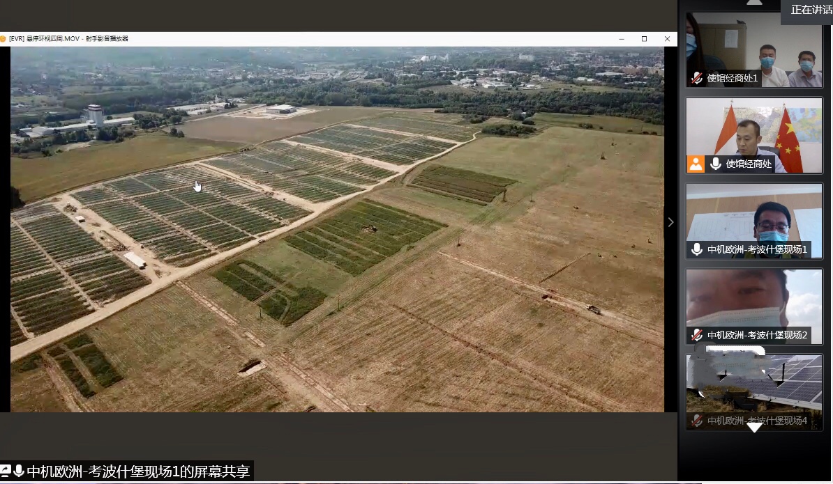 近期,匈牙利疫情嚴重反彈,我在匈企業和項目面臨多重風險。為保障我在匈中資企業和項目安全運行,9月15日,劉波公使銜經濟商務參贊視頻連線中國機械進出口公司考波什堡100兆瓦光伏電站項目施工現場,對其疫情防控和安全生產工作進行遠程督導。經商處馮春一秘、周一一秘、劉沛君二秘陪同參加。
