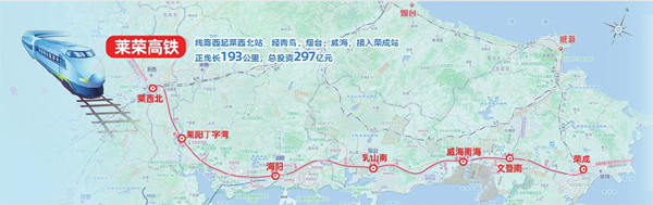 萊榮高鐵則是青銀高鐵通道向山東半島地區的延伸,線路西起萊西北站,經青島、煙臺、威海,接入榮成站,正線長193公里,總投資297億元,全線設萊西北、萊陽丁字灣、海陽、乳山南、威海南海、文登南、榮成7座車站。