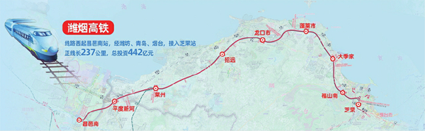 濰煙高鐵、萊榮高鐵是山東重點交通基礎設施項目。其中,濰煙高鐵是國家“八縱八橫”高鐵網中沿海高鐵通道的重要組成部分,線路西起昌邑南站,經濰坊、青島、煙臺,接入芝罘站,正線全長237公里,總投資442億元,全線設昌邑南、平度新河、萊州、招遠、龍口市、蓬萊市、大季家、福山南、芝罘9座車站。