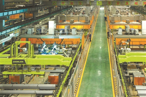 中聯重科常德塔機智能工廠一期工程,擁有12條自動化生產線,1萬多個傳感器、100多臺工業機器人、35臺無人搬運小車、16套數控加工中心等先進設備,平均每10分鐘產出1節標準節,每90分鐘生產一條起重臂。 湖南日報·華聲在線記者 唐俊 攝