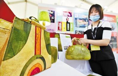 9月17日,第三屆河北國際工業設計周河北工業設計成果展區內,工作人員正在展示一款用樹葉制作的手包。 河北日報記者 趙海江攝
