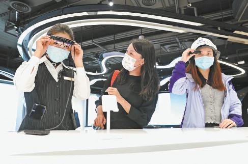 昨天,參觀者在麗澤金融商務區麗澤SOHO31層5G實驗室體驗5G新技術帶來的變化。工作人員為參觀者現場演示5G技術在醫療、自動駕駛、人工智能等領域的各種應用(劉平/攝)