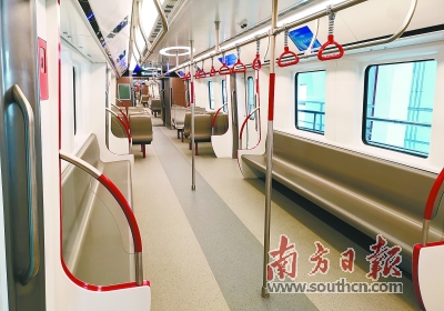 此次交付的列車外形采用富有張力的“飛翼”造型,與普通的地鐵列車差別較大,整體外形與高鐵動車相仿。列車車廂里既包含廣州地鐵特征的元素,又融入了高鐵動車組的特點。中車株機副總工程師柳曉峰介紹,列車在設計過程中充分考慮了市域快線特點,中間車設置4對大開度雙開塞拉門,實現乘客快速乘降。采取有別于普通地鐵的橫縱結合座椅布局(見下圖,符超軍攝),載客量比高鐵動車組多20%。