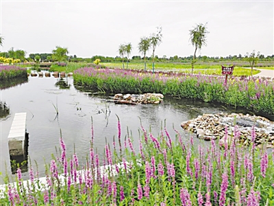 人工濕地內,各類水生植物凈化水體的同時,也扮美了環境。