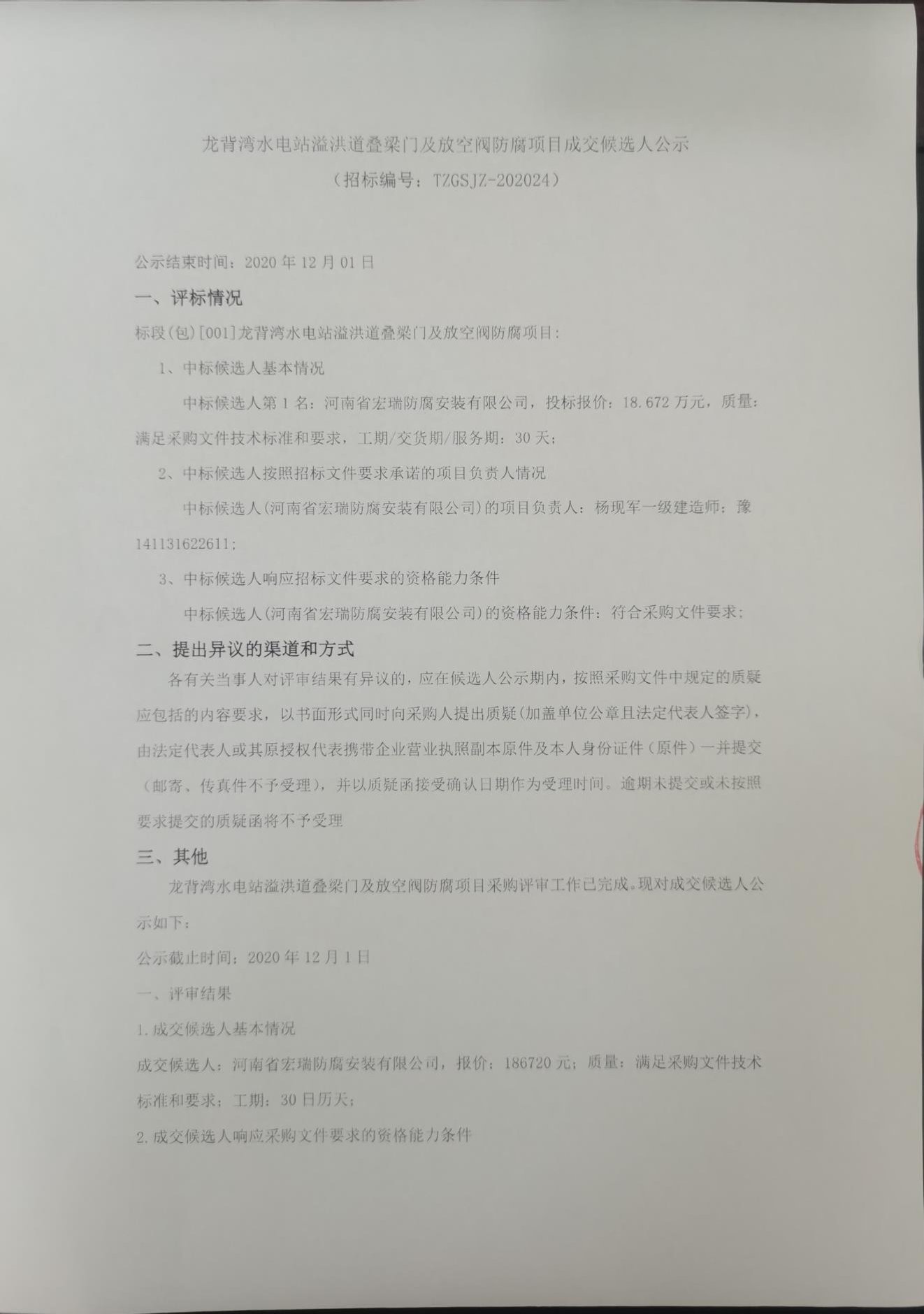 移動版:龍背灣水電站溢洪道疊梁門及放空閥防腐項目成交候選人公示