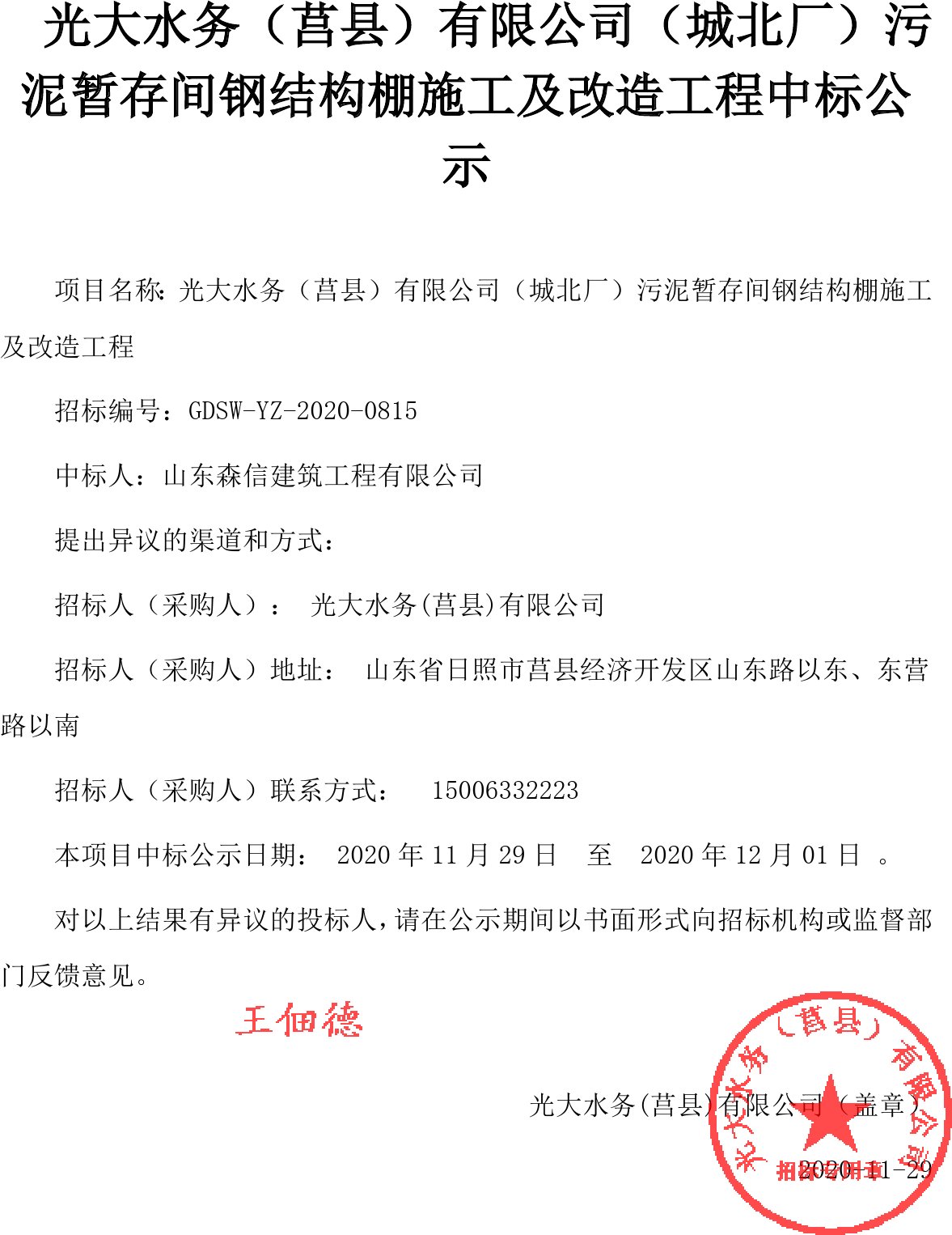 移動版:光大水務(莒縣)有限公司(城北廠)污泥暫存間鋼結構棚施工及改造工程中標結果公示