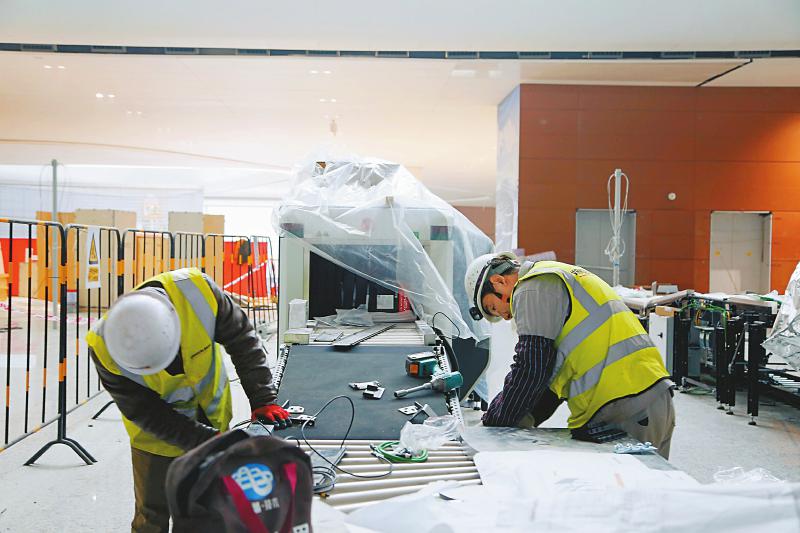 順著大廳中間的通道往里走去,是旅客必經的安檢通道。在這里,工人們將一套套安檢設備拆除外包裝后,開始進行安檢閘機、智能安檢線的安裝。