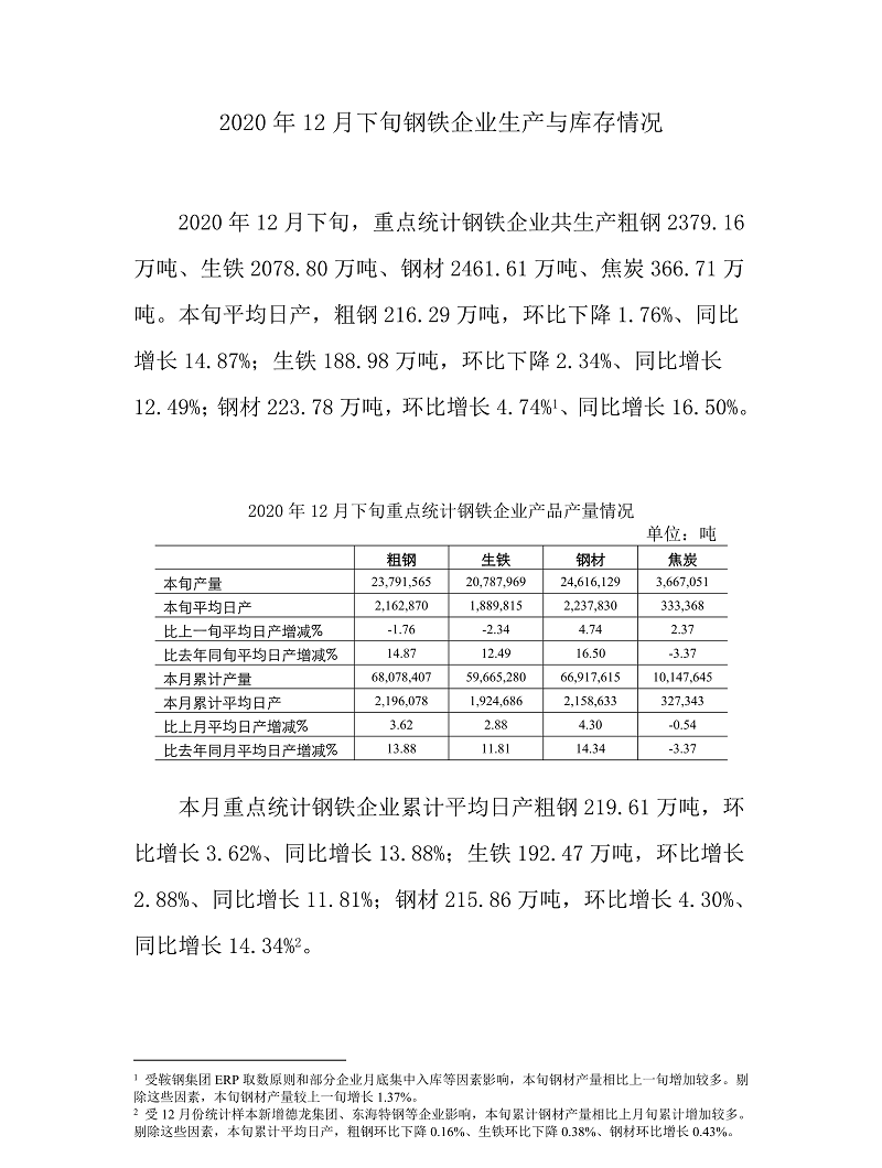 中鋼協數據顯示,2020年12月下旬,重點統計鋼鐵企業共生產粗鋼2379.16萬噸,生鐵2078.80萬噸,鋼材2461.61萬噸,焦炭366.71萬噸;重點鋼企當旬粗鋼日均產量為216.29萬噸,環比減少3.87萬噸,降幅為1.76%。2020年12月份,重點鋼企粗鋼日均產量為219.61萬噸,環比增加3.62%,同比增加13.88%。