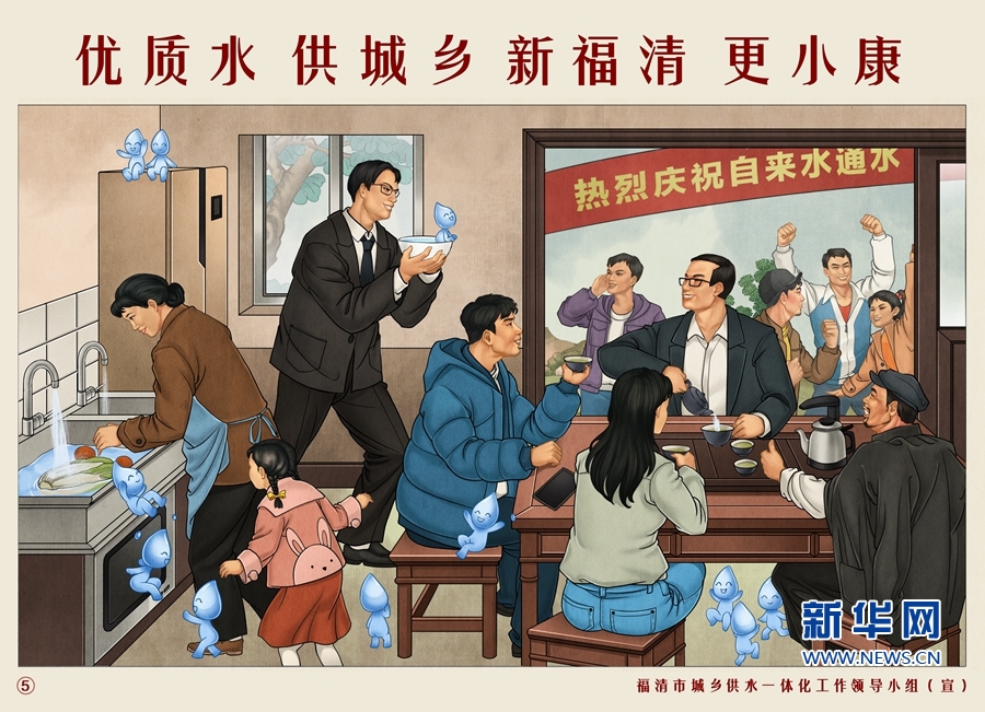 “戶戶通有計劃做設計出圖紙”“全動員齊出力定模式籌資金”“找隊伍買材料細施工強監督”“鋪好管通上水先驗收后移交”“優質水供城鄉新福清更小康”,這5句話配上5幅色彩明亮、生動活潑的畫面,組成了福清推進城鄉供水一體化的政策宣解插畫。