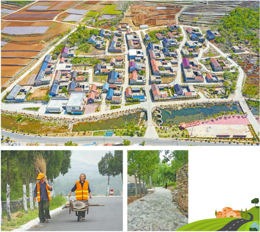 上圖:沂南縣雙堠鎮通村道路進行了硬化。左下圖:蒙陰縣坦常路上,村民正在管護公路。右下圖:崮崖村利用石板修路,突出古村落的古樸風格。