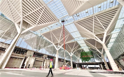 記者從市住建委獲悉,目前,國家會展中心(天津)工程建設正在加快推進,一期工程已完成鋼結構、幕墻、屋面工程,正在進行室內精裝、設備安裝等收尾工作,機電系統開始逐步調試,已具備送電、送水條件;二期基礎工程、人防地下室主體結構已完成,正在進行鋼結構屋面梁施工。全部場館計劃于2022年12月建成投用。