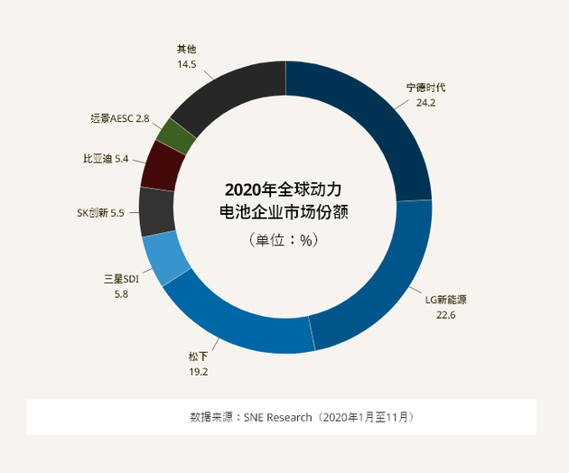 根據市場研究公司SNE Research發布的數據,寧德時代是全球最大的動力電池供應商,在2020年前11個月中其市場份額為24.2%。LG化學則以22.6%的市場份額位居第二。
