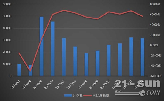 而且,更加令人驚喜的是,如此高的月銷量,并沒有透支市場需求,在接下來的幾個月里,挖掘機一路奔襲,持續大幅刷新歷史同月銷量紀錄!最終,在一二月開局不利的形勢下,在疫情的干擾之下,硬是連續第三年創出銷量紀錄!這個過程,怎一個“硬”字了得!