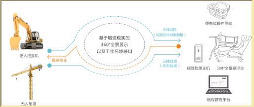 在工程機械上的多個關鍵位置安裝攝像頭及傳感器,視頻信號以及傳感器數據通過無線網絡傳輸到遠程駕駛艙,駕駛艙內的視頻處理主機對多路視頻進行智能化拼接處理,生成360°全景畫面;360°全景操控臺的操控指令通過無線鏈路回傳到工程機械上的控制單元,最終實現對工程機械的遠程操控。