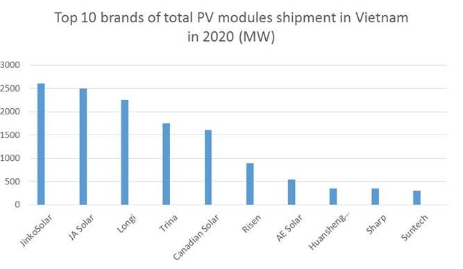 越南MOIT與Clean Energy Associate官方媒體Vietnam Energy Online近日發布2020年越南組件出貨量市場報告,數據統計顯示,晶科能源以超過2.5GW的銷量,連續第三年穩居越南市占第一。晶澳,隆基分列第二、第三,阿特斯,東方日升,新源,東方環晟,夏普,尚德緊隨其后。
