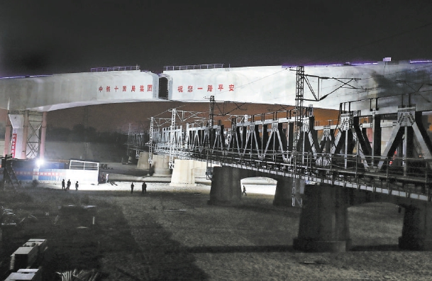 昨天凌晨1點50分,經過49分鐘施工,豐臺站改建工程跨京廣鐵路大橋完成轉體。 記者 安旭東攝
